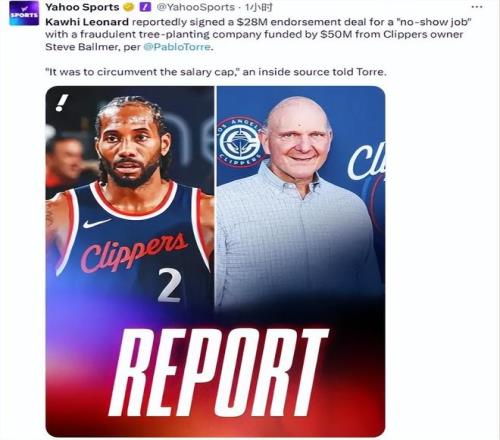 与场上惨淡战绩相呼应的是场外不断发酵的丑闻。9月初,NBA记者Pablo Torre爆料快船和伦纳德之间存在阴阳合同。调查揭露,伦纳德曾与一家名为Aspiration的碳中和公司签订4年2800万美元的代言合同,但这份工作实际上是一个根本不存在的挂名职位。更令人震惊的是,快船老板鲍尔默向这家公司秘密注资5000万美元。